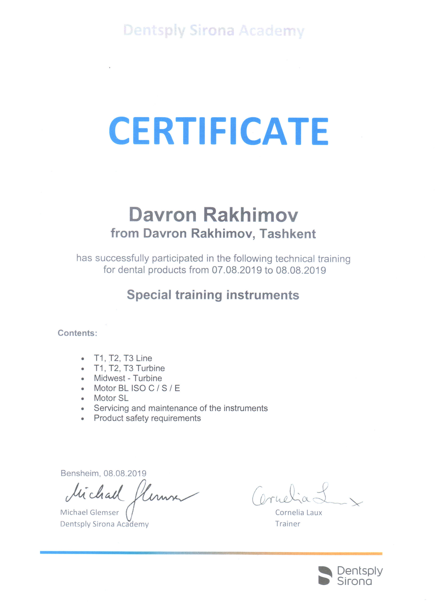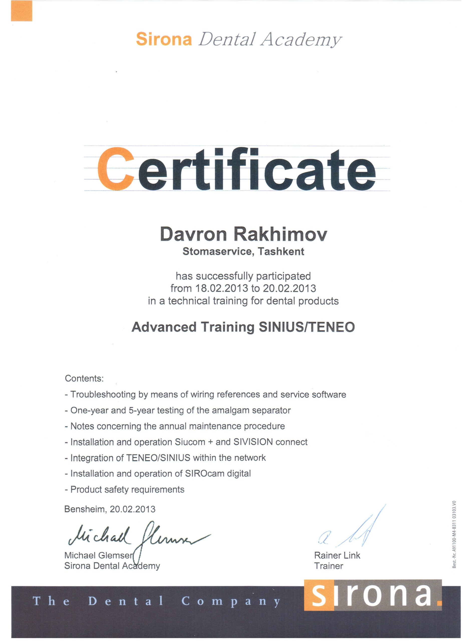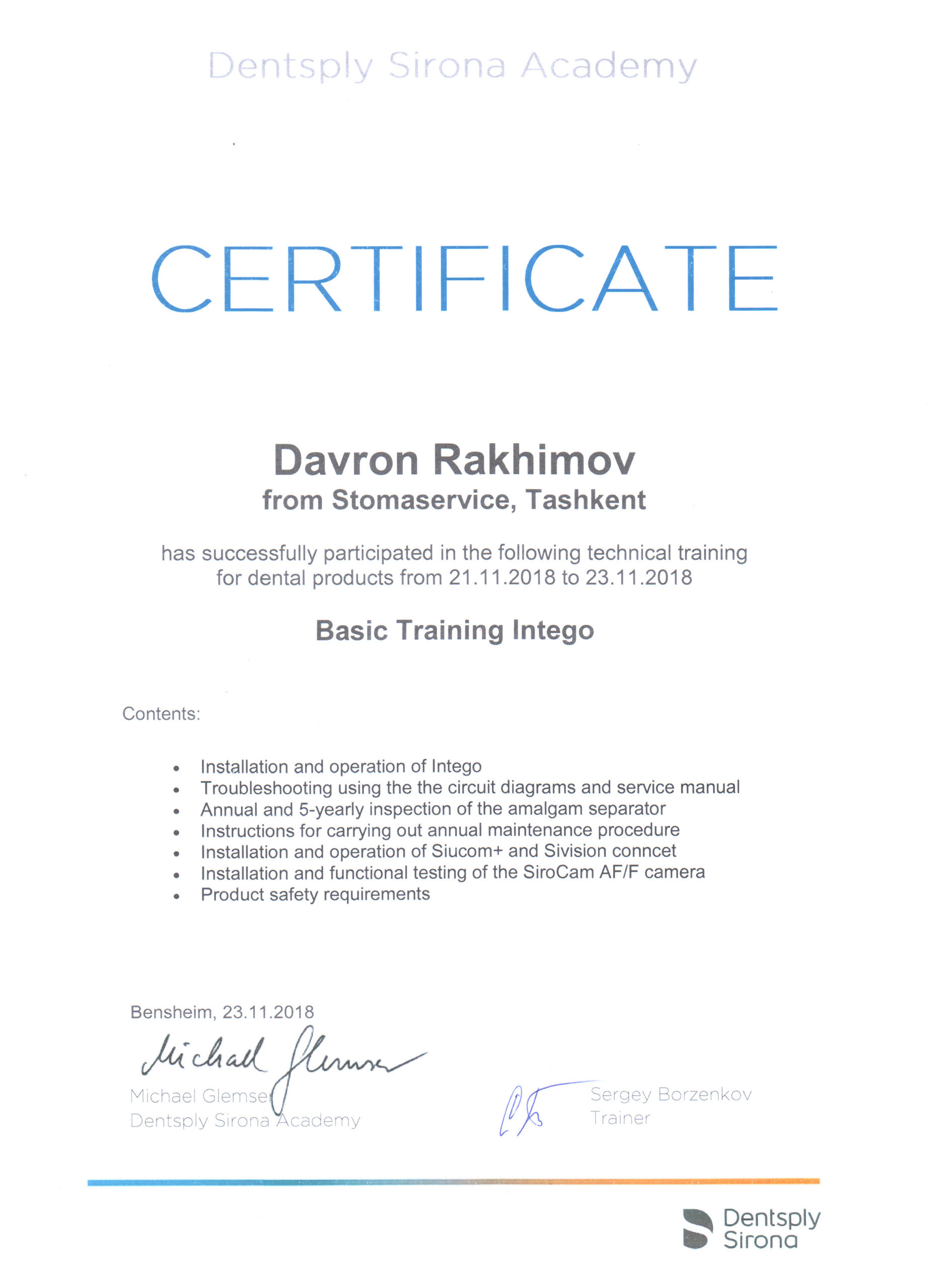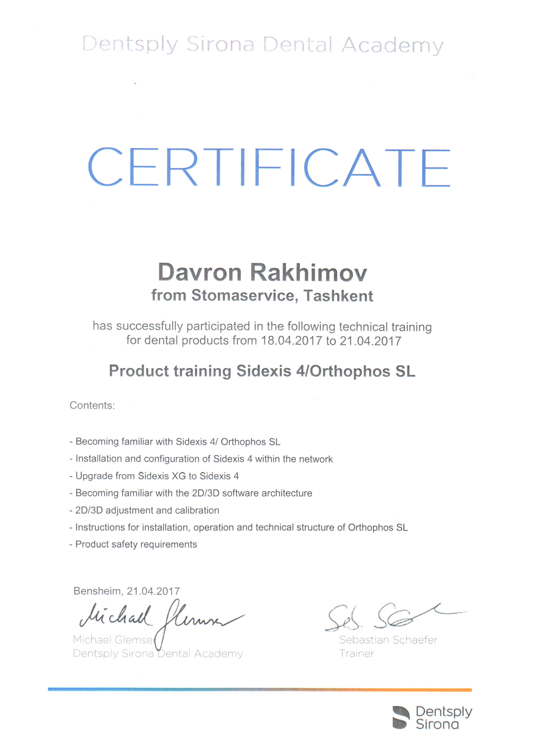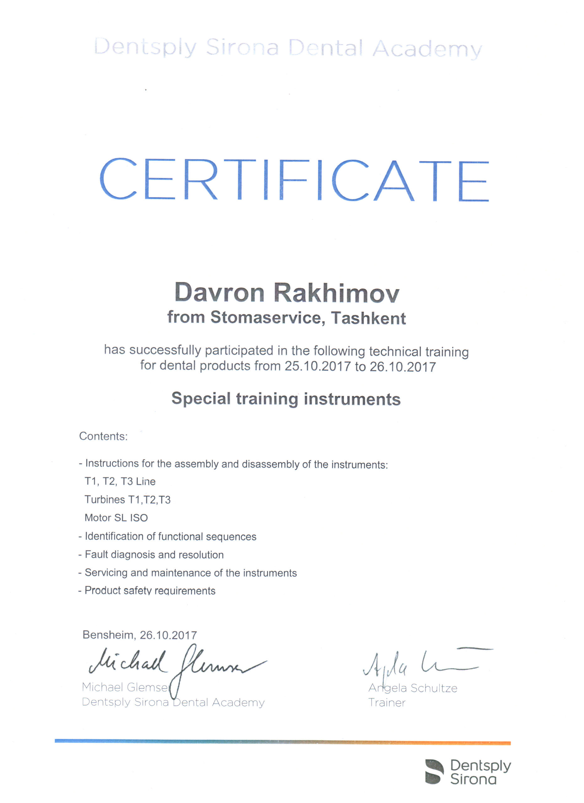 Мы являемся представителями крупнейшего немецкого производителя высококачественных стоматологических продуктов и технологий – Dentsply Sirona, в Узбекистане с 2012 года. Вместе с нашими партнерами мы помогаем стоматологам предоставлять пациентам первоклассную стоматологическую помощь — для здоровой улыбки. Мы стремимся преобразовать стоматологию для улучшения здоровья полости рта во всем мире, и мы гордимся тем, что являемся предпочтительным партнером для стоматологических кабинетов, клиник, зуботехнических лабораторий по всему Узбекистану.